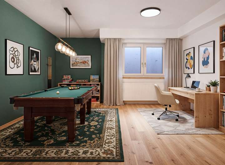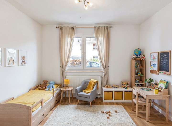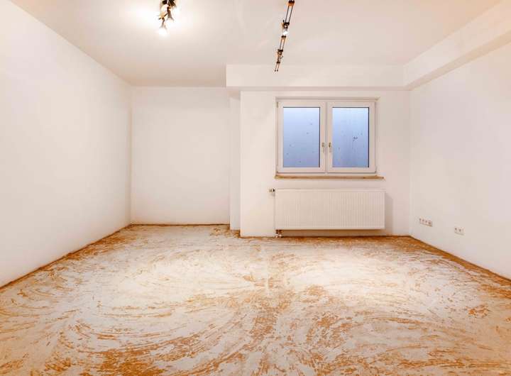 ° Im Kinderzimmer sowie im Hobbyraum ist aktuell nur Estrich vorhanden. Für beide Räume ist eine Bodenverlegung einzuplanen