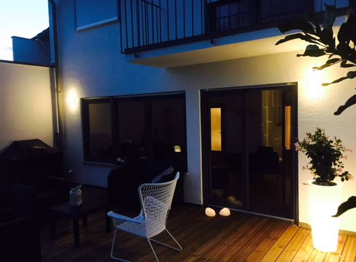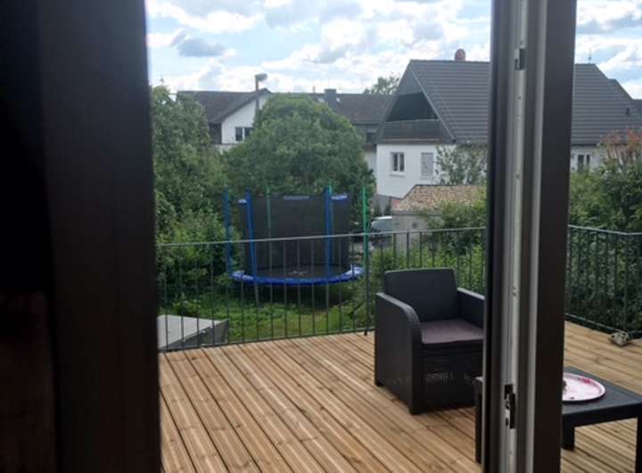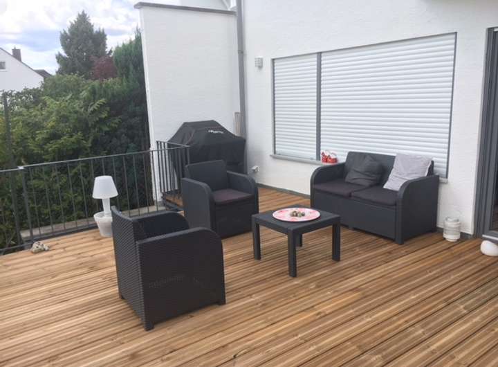 ca. 33 m2 große Terrasse mit Holzbelag und kleine Terrasse vor der Küche mit Holz