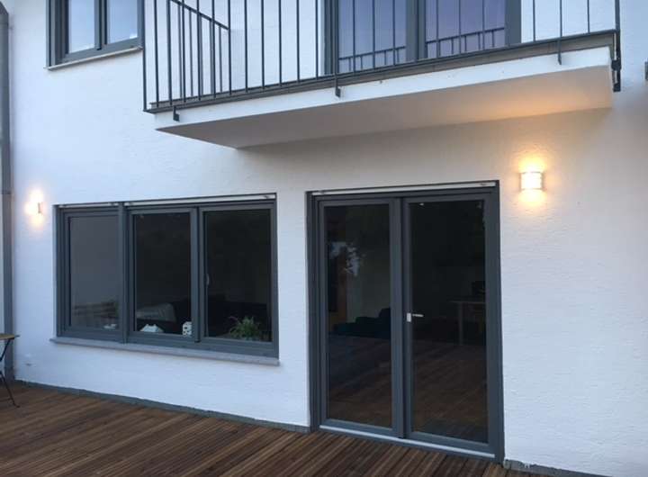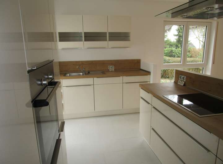 Im Erdgschoß großzügiger, heller, freundlicher Wohn-/Essbereich mit offener Küche, z.T bodentiefen Fenstern, mit Zugang zur ca. 33 m2 großen Terrasse. Eine Einbauküche mit allen Geräten in Weiß/Lack ist bereits vorhanden - ohne Aufpreis. Von der Küche aus betritt man eine kleine Frühstücksterrasse.