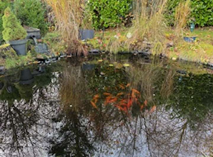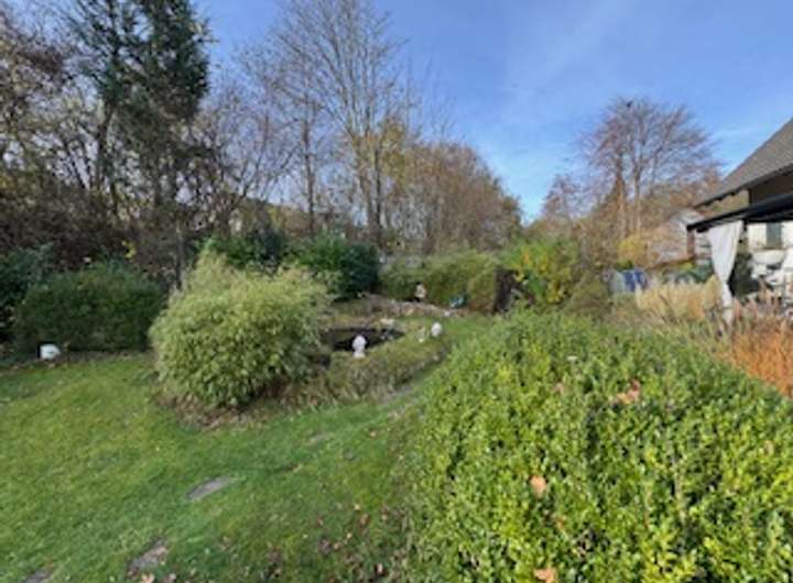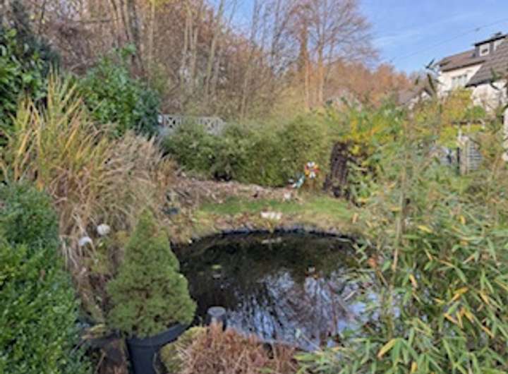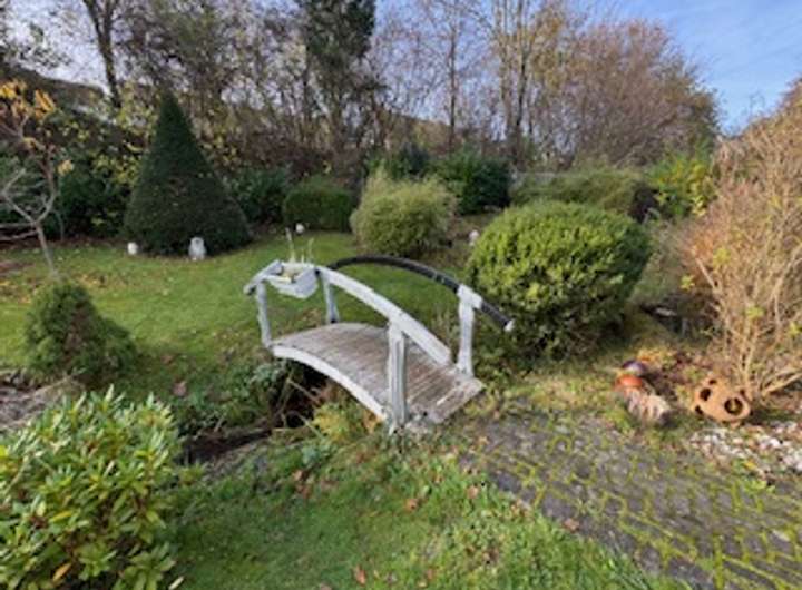 Neben dem Bachlauf, Gartenteich und den vielen Terrassen zum Verweilen ist hier noch ein großer Wiesenbereich vorhanden. Ein Paradies für Kinder und Tiere.