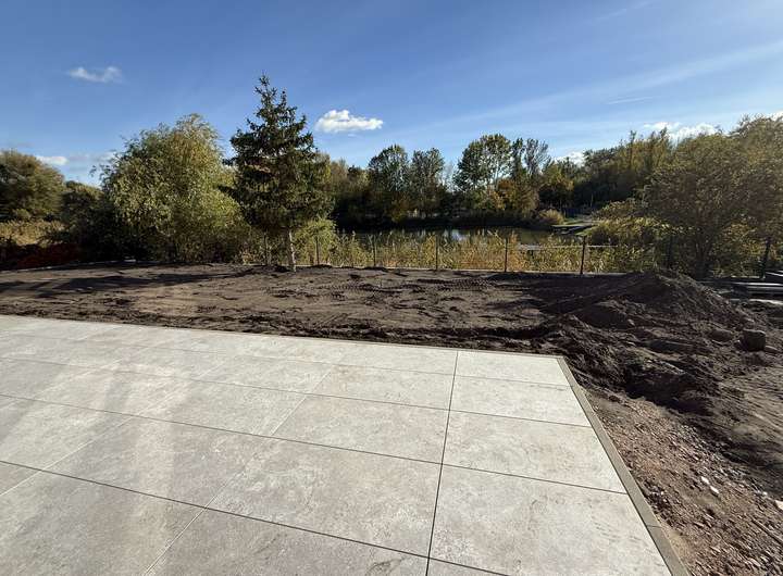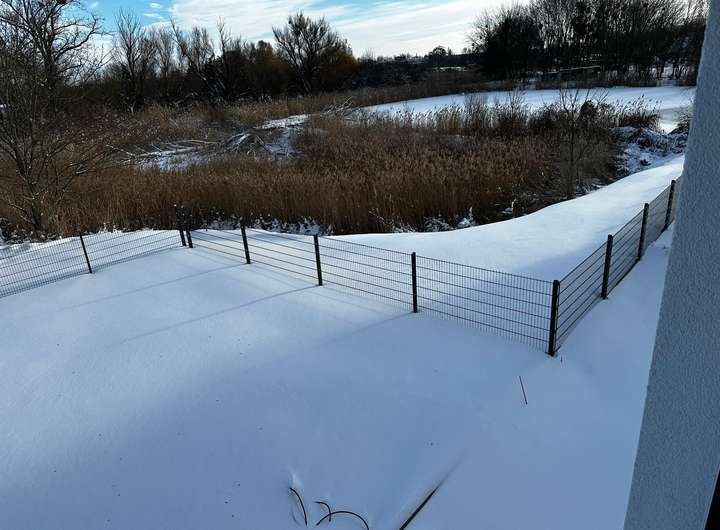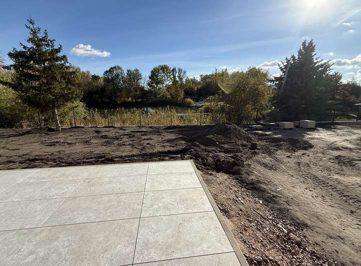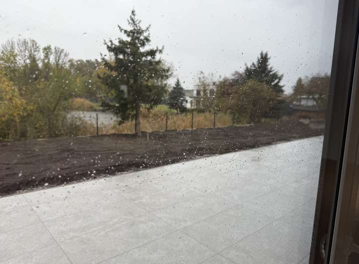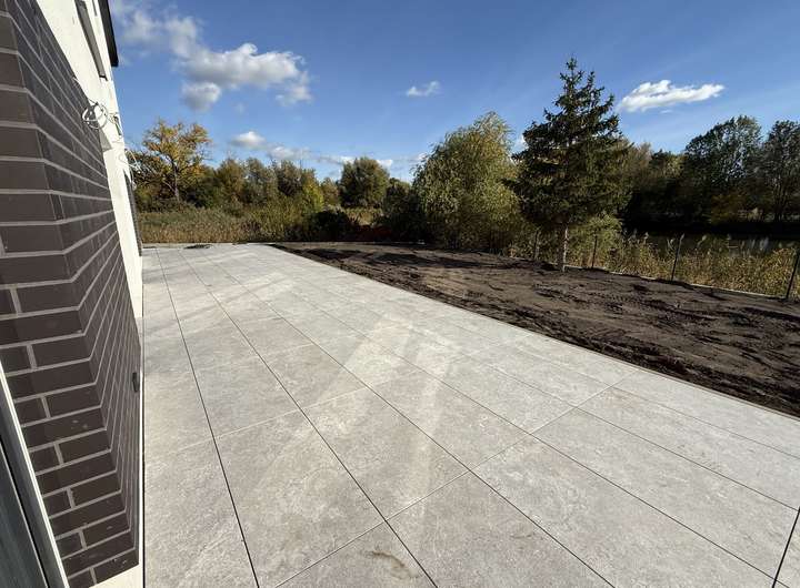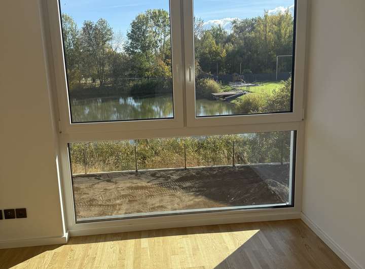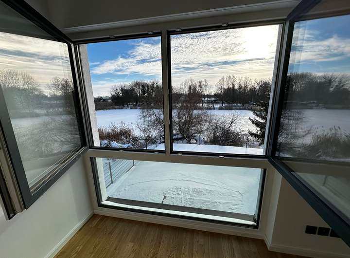 • Große Terrasse mit fast uneinsehbarem Ausblick über Wasser und Natur, mit Lärm,-und Sichtschutzwand