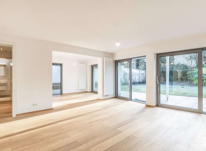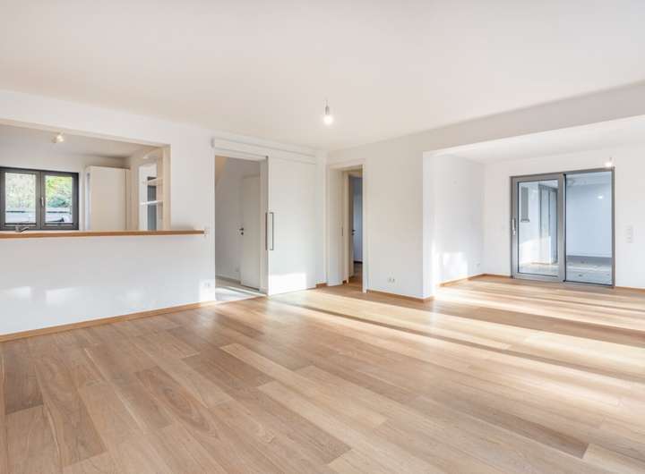 In den Wohnräumen wurde echtes Eichenholzparkett verlegt, während Küche, Bäder und Eingangsbereich mit edlen Natursteinplatten ausgestattet sind. Diese Kombination verleiht dem Haus eine warme, hochwertige Atmosphäre und sorgt zugleich für Langlebigkeit und einfache Pflege.