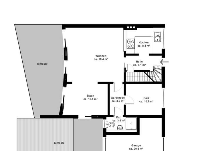 Terrasse, Garten, Keller, Vollbad, Duschbad, Einbauküche, Gäste-WC, Parkett