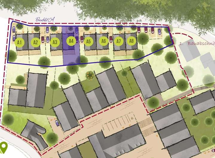 Im ersten Bauabschnitt des Klosterareals entstehen auf Baufeld A acht Einfamilienhäuser in Form von vier modernen Doppelhäusern. Die projektierten Grundstücke liegen ruhig, direkt am Meulenwald - und dennoch bestens angebunden. Alle Häuser verfügen über eine Terrasse mit Südausrichtung, einen eigenen Garten, einen Balkon im Erdgeschoss sowie zwei Stellplätze je Haus.