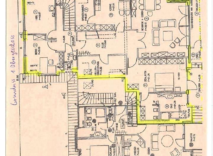 Die Wohnung verfügt über einen separaten Eingang mit Foyer. Über eine Treppe gelangt man in das 1.Obergeschoss. Hier befinden sich das große lichtdurchflutete Wohnzimmer, die geräumige Küche mit integrierter Speisekammer, 3 Schlafzimmer, ein großes Bad mit Wanne und Dusche, ein Gäste-WC sowie ein großer Abstellraum. Der große, weitläufige Balkon geht vom Wohnzimmer und von der Küche ab und ist nach Südost sowie nach Südwest gerichtet. Hier kann man herrlich entspannen und den Ausblick über die Felder genießen. Ein weiterer Südwest-Balkon ist über das große Bad und das große Schlafzimmer zu erreichen.