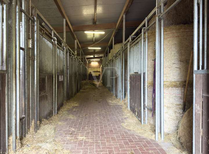 Unmittelbar hinter der Halle befindet sich der Pferdestall. Er umfasst aktuell zwölf Einzelboxen, einen Futterplatz, einen Waschplatz sowie einen Sattelraum. Auslaufmöglichkeiten sind auf dem eigenen Grundstück oder auf gepachteten Flächen vorhanden. Etwaige Pachtverträge können bei Bedarf übernommen werden.