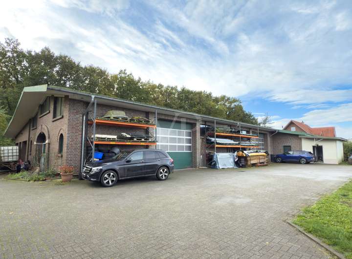 Auf dem beeindruckenden, rund 6.529 m² großen Grundstück wurde zunächst ca. 2004 die Gewerbehalle errichtet. Sie umfasst eine Fläche von rund 375 m² und bietet ausreichend Lagermöglichkeiten. Sie ist mit zwei elektrischen Rolltoren ausgestattet. 2012 erfolgte ein Anbau mit einem separaten Hausanschlussraum und einem Kühlhaus, zeitgleich wurde in der Halle ein Lagerboden errichtet.