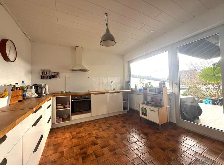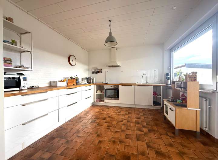 Ebenfalls auf der linken Seite öffnet sich der großzügige Wohn-, Ess- und Küchenbereich mit direktem Zugang zur sonnigen Südterrasse und dem schön angelegten Garten – ein perfekter Ort zum Entspannen oder für gesellige Stunden mit Familie und Freunden.