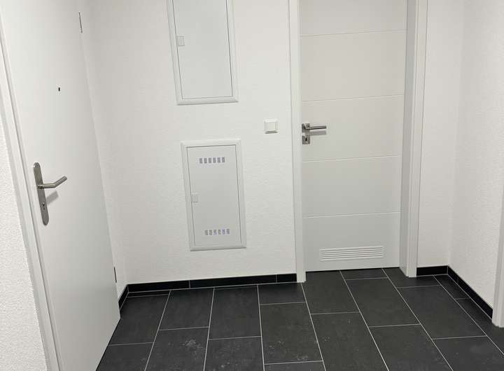 Die Diele, die Garderobe und das Bad sind mit anthrazitfarbigen Fließen ausgelegt.