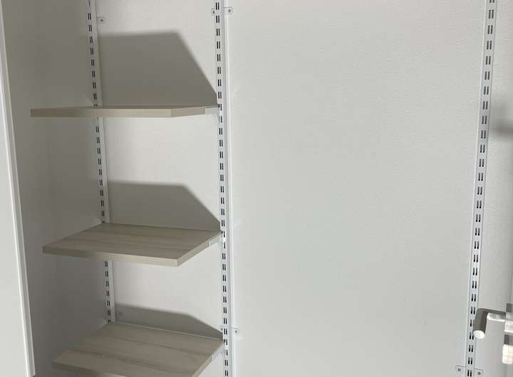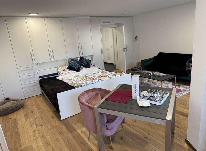 Im offenen Raum ist eine helle Schreiner-Wohn-Schlafwand fest eingebaut, bei welcher das originelle Doppelbett in der Wand elektrisch vertikal perfekt versteckt werden kann.