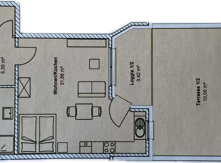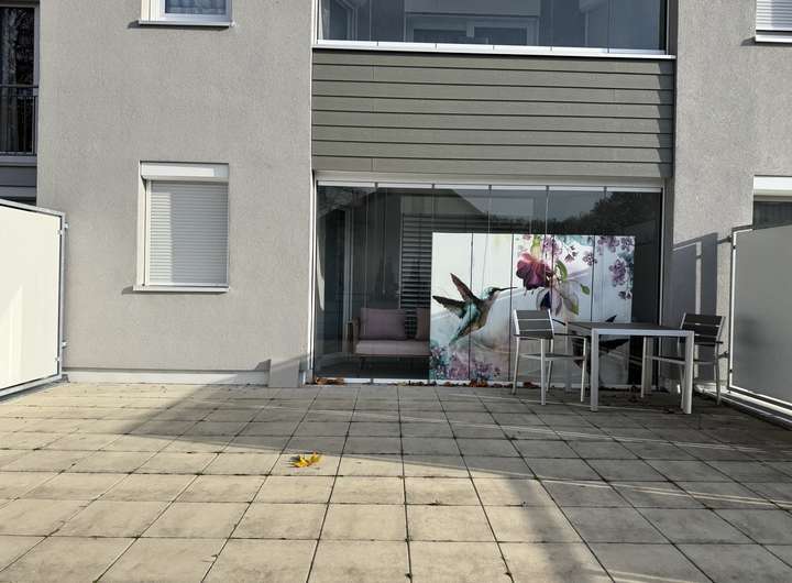 Von der Küche mit einer Terrassentüre und dem Wohnbereich mit einer Schiebetüre kann die Loggia betreten werden. Die Loggia mit grauen Bodenplatten ausgestattet, ist mit einer faltbaren Glaswand zur großzügigen Terrasse verschließbar.