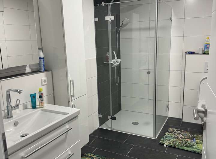 Das Badezimmer hat Wellness getankt und ist elegant und modern, komplett ausgestattet mit in beleuchteten Möbel integriertem Keramikwaschtisch, beleuchteten Spiegelschrank und separatem Hochschrank. WC-Anlage bestehend aus Tiefspüler und Wand-Bürstengarnitur. Bodenebene Duschwanne mit Cockpit-Duschsystem und aus Glass eingebauter Abtrennung. An der Wand angebrachter Handtuchheizkörper. Boden- und teilweise Wandfliesen aus anthrazitfarbigem und hellem Feinsteinzeug.