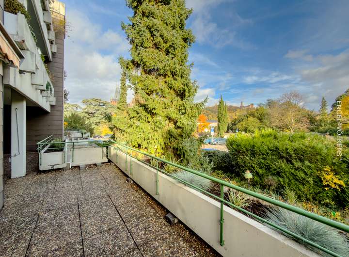 Das Herzstück bildet das rund 46 m² große Wohn- und Esszimmer mit Zugang zur ca. 24 m² großen, teilweise überdachten Terrasse in Ost-Ausrichtung. Große Fensterfronten sorgen für lichtdurchflutete Räume und ermöglichen den Zugang zur Terrasse sowohl vom Wohn- als auch von den Schlafzimmern aus. Hier genießen Sie bei schönem Wetter die zentrale Lage mit herrlichem Burgenblick. Eine Markise sorgt für angenehmen Sonnenschutz; Pflanztröge für eine dekorative Begrünung sind ein Teil der architektonischen Gestaltung. Gartengeräte können im kleinen, praktischen Abstellraum auf der Terrasse untergebracht werden.