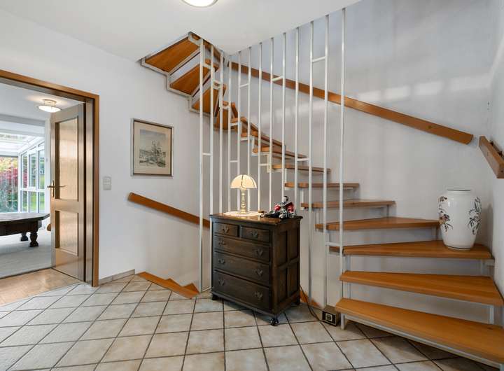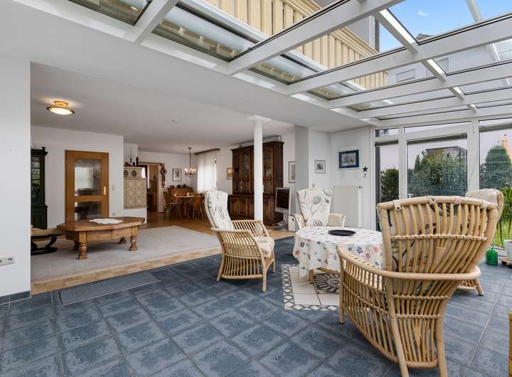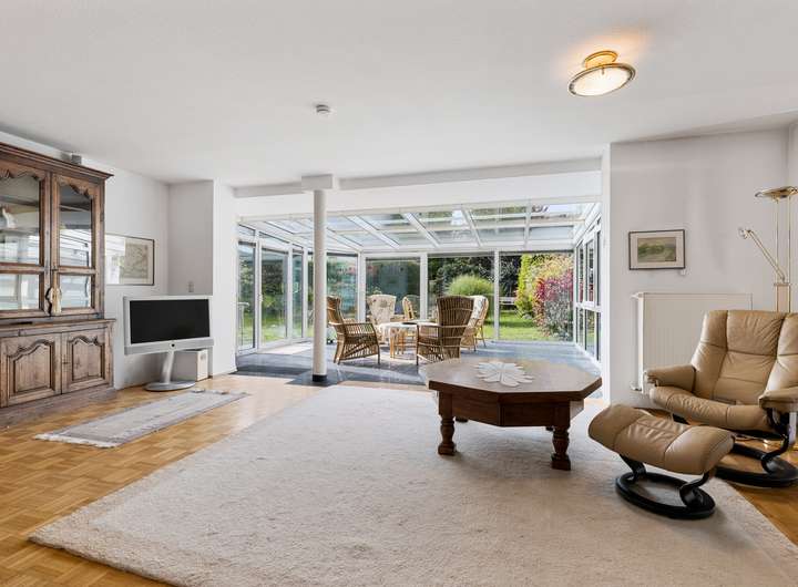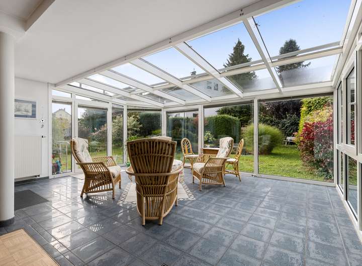 Es ist sehr großzügig geschnitten, lichtdurchflutet und sehr gepflegt und hat als REH einen vergleichsweise großen Garten. Im Erdgeschoss besticht das große Wohnzimmer mit einem großen, integrierten Wintergarten. Hier leben Sie verbunden mit dem schön angelegten Garten (siehe Fotos und Pläne). Die Räumlichkeiten im einzelnen: