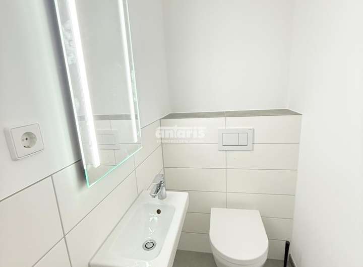 Das modern gestaltete Badezimmer lässt keine Wünsche offen: Es verfügt über eine bodengleiche Dusche, eine komfortable Badewanne sowie ein Doppelwaschbecken mit stilvoller Ausstattung. Zusätzlich steht ein separates Gäste-WC zur Verfügung.