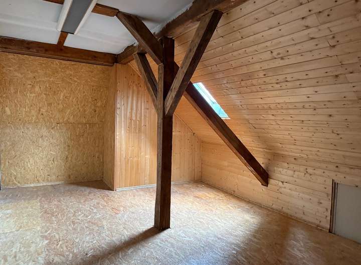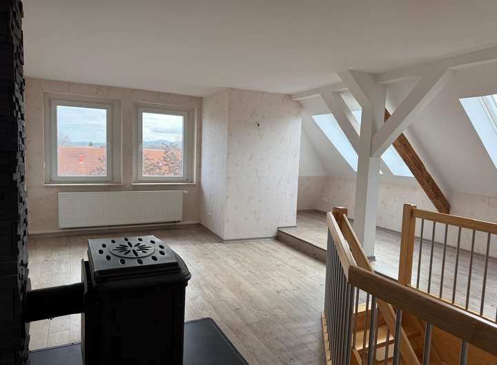Ein besonderes Extra ist das Dachgeschoss, das über eine separate Treppe erreichbar ist. Hier erwarten Sie ein weiterer großzügiger Wohnbereich mit eigenem Kaminofen – ideal als Rückzugsort oder als Ort für gesellige Runden.