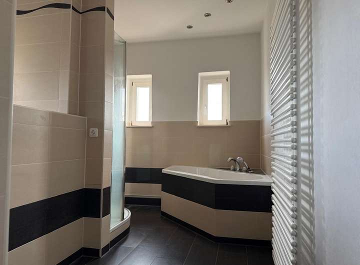 2 moderne Badezimmer stehen zur Verfügung: Das eine mit einer komfortablen Wanne, das andere mit einer ebenerdigen Dusche.