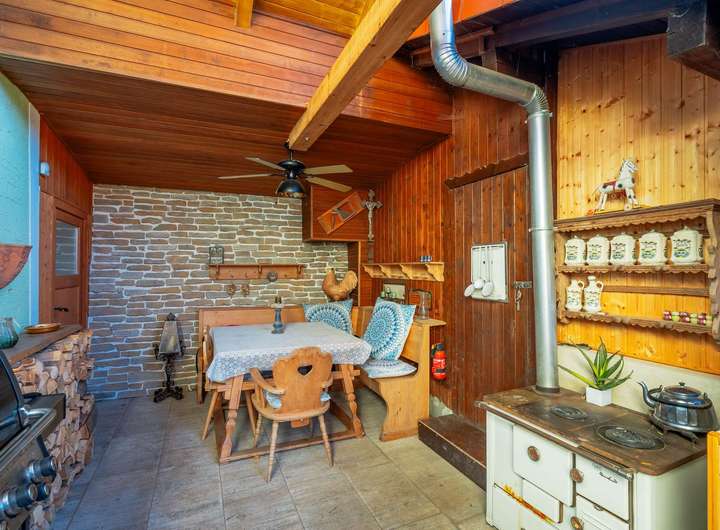 Im Wohnzimmer sorgt zudem ein zusätzlicher Holzofen für gemütliche Wärme und eine besonders behagliche Atmosphäre.