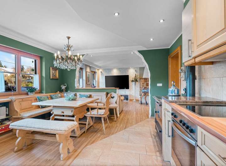 Die Küche im Erdgeschoss präsentiert sich im hochwertigen, massiven Landhausstil und fügt sich mit ihrer warmen, liebevollen Gestaltung harmonisch in das Gesamtbild des Wohnbereichs ein – schlichtweg wunderschön.