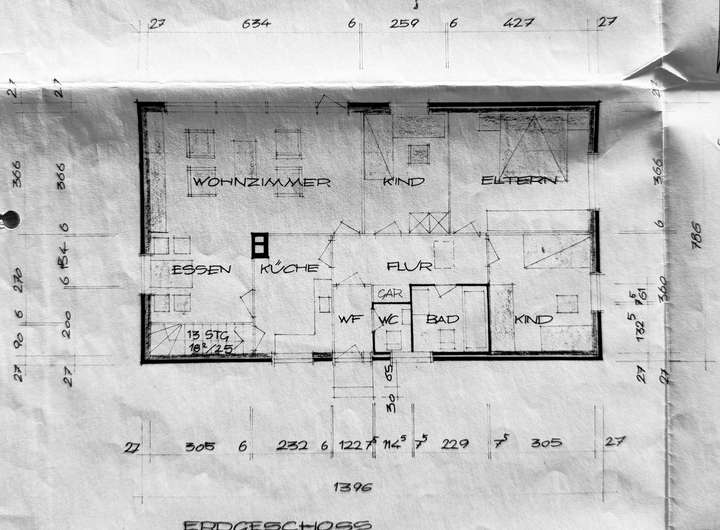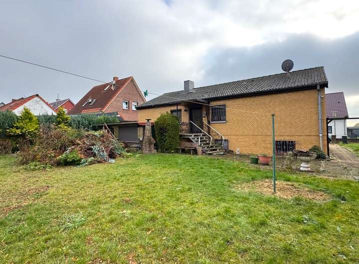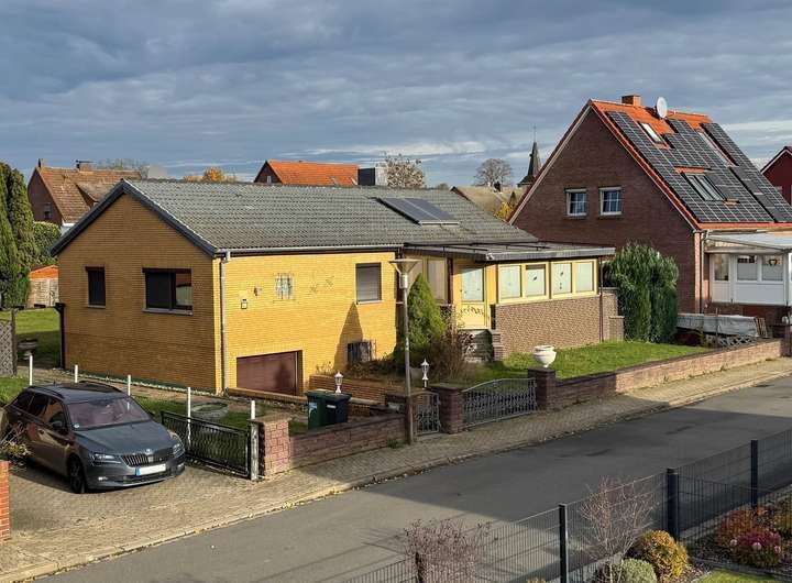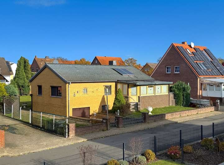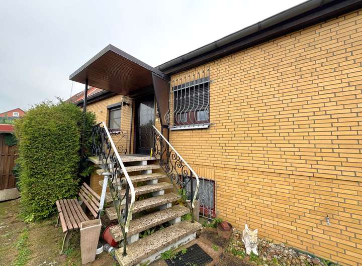 Der freistehende Bungalow wurde ca. 1970 in Fertigbauweise mit massiver Klinkerfassade errichtet und bietet ca. 100 m² Wohnfläche auf einer Ebene. Das Haus ist vollunterkellert und verfügt über eine Garage im Kellergeschoss mit direktem Zugang ins Haus.