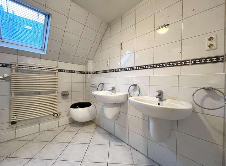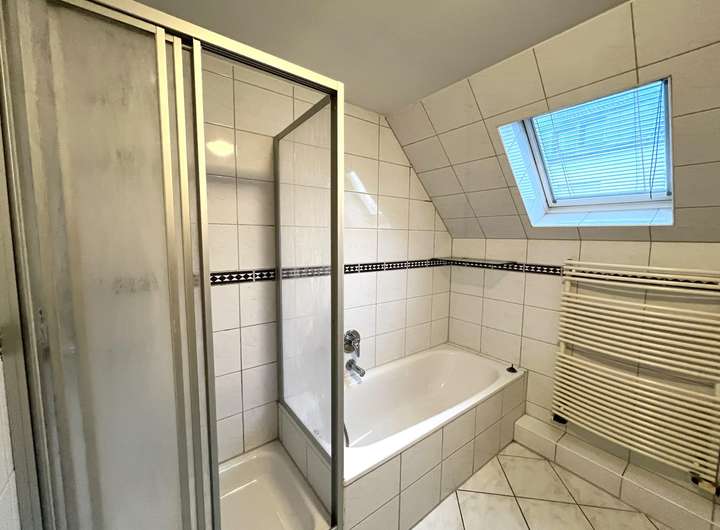 Im Obergeschoss befinden sich neben drei Schlafräumen und einem Abstellraum auch das großzügige Tageslicht-Badezimmer mit Dusche und Badewanne.