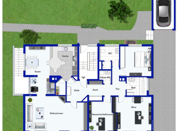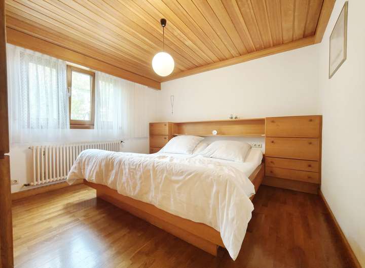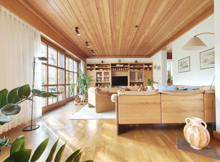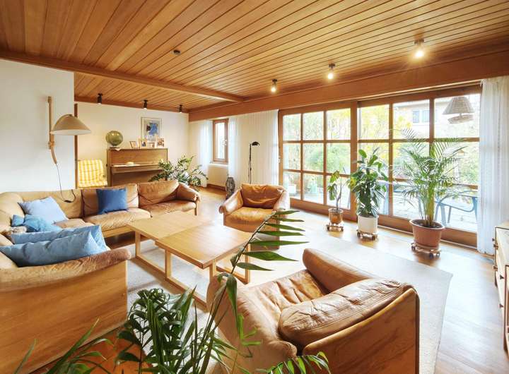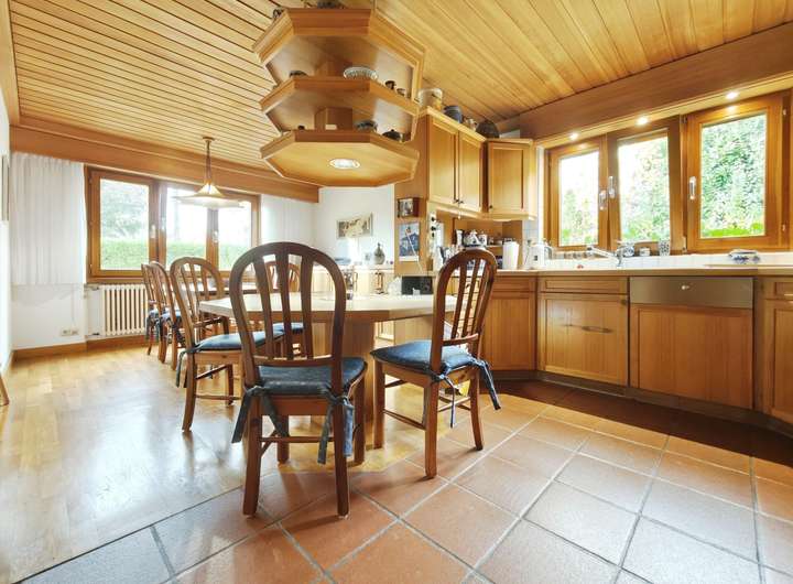 Das Obergeschoss diente über viele Jahre als Bürofläche, während die beiden Erdgeschosswohnungen zu einer großzügigen Wohneinheit zusammengeführt wurden. Diese überzeugt durch einen offenen Grundriss und bietet einen direkten Zugang zum gepflegten Gartenbereich.