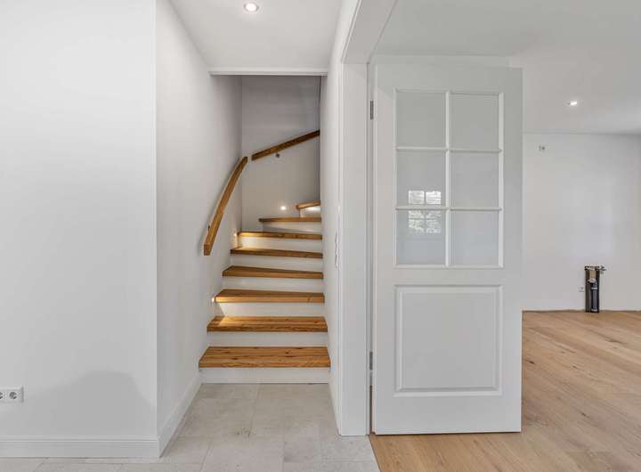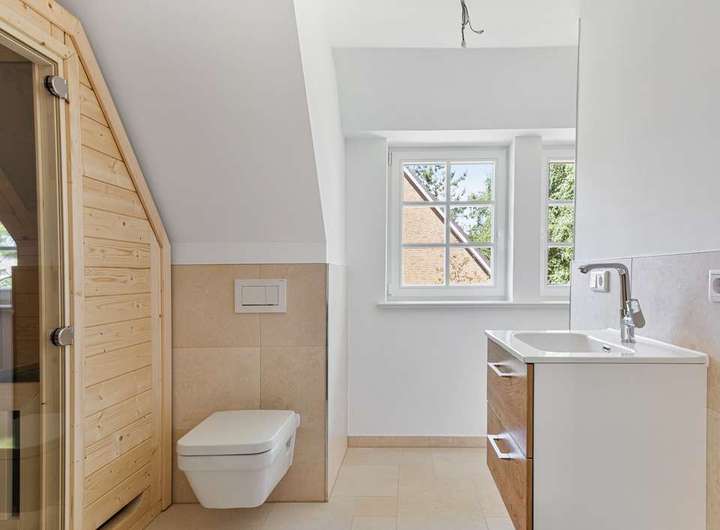 Das Obergeschoss erreichen Sie über eine elegante Treppe mit indirekter Beleuchtung und Eichenholzstufen. Hier befinden sich zwei großzügige Schlafzimmer ,davon ein Schlafzimmer mit einem Bad en Suite und ein weiteres, großes Badezimmer, das mit einer integrierten Sauna und einer Regenfalldusche ausgestattet ist. Auch hier wurden die hochwertigen Natursteinfliesen verwendet. Die Wohn- und Schlafräume sind mit edlem Eichenholzboden ausgestattet.