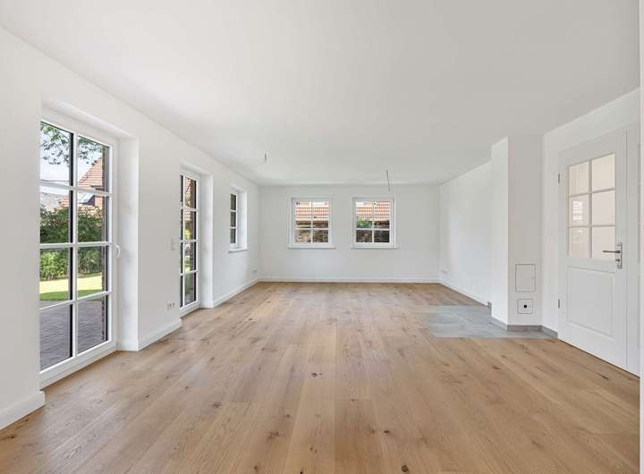Das Highlight des Erdgeschosses ist der geräumige Wohn- und Essbereich mit offener Küche, die sich ideal für eine Kücheninsel anbietet. Eine doppelflügelige Tür öffnet diesen Bereich zum Garten und zur Terrasse hin. Große Fenster und Türöffnungen sorgen für viel Tageslicht und einen harmonischen Übergang zum Außenbereich. Zudem besteht die Möglichkeit, einen Kamin zu installieren, der für zusätzliche Gemütlichkeit sorgt.