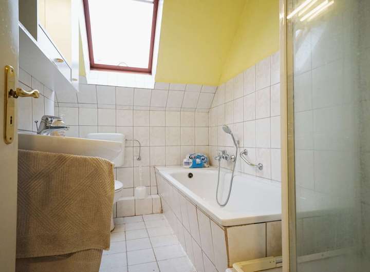 Die Ausstattung entspricht dem mittleren Standard. Die Elektrik wurde bereits erneuet. Das Dach ist mit Glaswolle gedämmt. Warmwasser erfolgt über einen Gasboiler in der Küche. Auf jeder Etage ist ein Badezimmer / WC vorhanden, teilweise mit Fenster. Es sind ebenfalls zwei Einbauküche vorhanden. Die Fenster sind 2-fach verglaste Kunststofffenster.