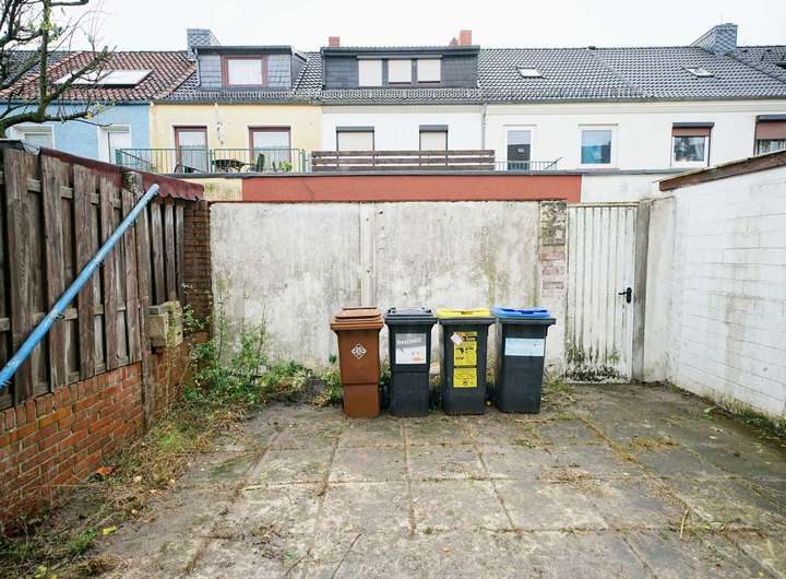 Die angebotene Immobilie ist ein im Jahr 1935 erbautes Reihenmittelhaus, das sich auch ideal als Zweifamilienhaus nutzen lässt. Auf drei Vollgeschossen verteilt sich eine Wohnfläche von ca. 115 m² mit insgesamt drei Zimmern. Das Erdgeschoss wird über einen Flur betreten. Von hier aus gelangt man in ein Schlafzimmer, eine funktionale Einbauküche sowie in zwei separate Badezimmer eines mit Badewanne, das andere mit Dusche. Auf der linken Seite des Flurs führt eine Treppe in das Obergeschoss. Im Obergeschoss befindet sich ein einladendes Wohn- und Esszimmer, eine weitere Küche mit Zugang zu einer überdachten Loggia sowie einem Gäste-WC. Die Treppe führt weiter ins Dachgeschoss, das ein großzügiges Schlafzimmer beherbergt, das sich über die gesamte Hausbreite erstreckt. Ebenfalls auf dieser Ebene befindet sich ein Tageslichtbad mit Dusche und WC. Das Haus ist vollständig unterkellert. Im Kellergeschoss stehen ein klassischer Abstellraum, eine Werkstatt sowie eine Waschküche zur Verfügung.