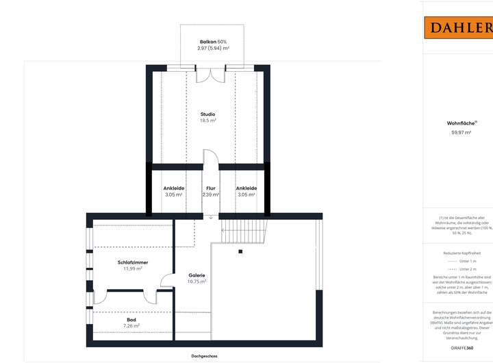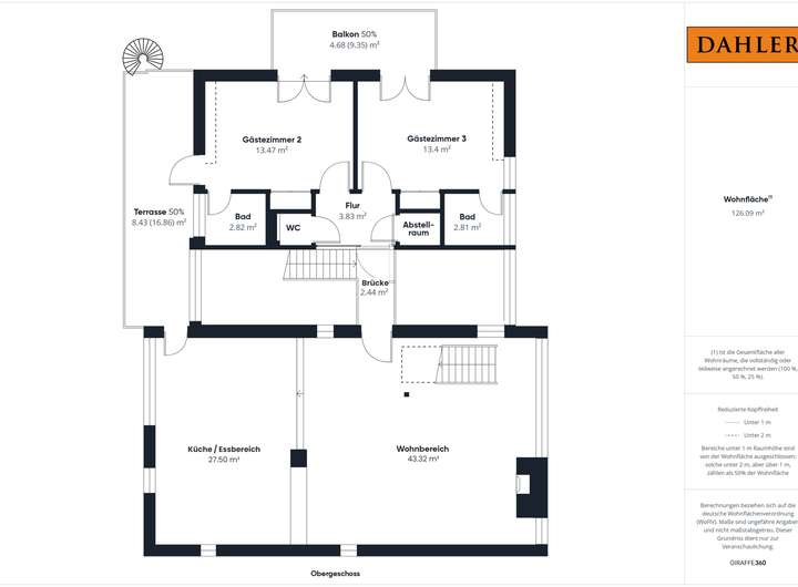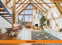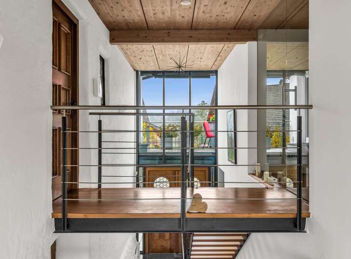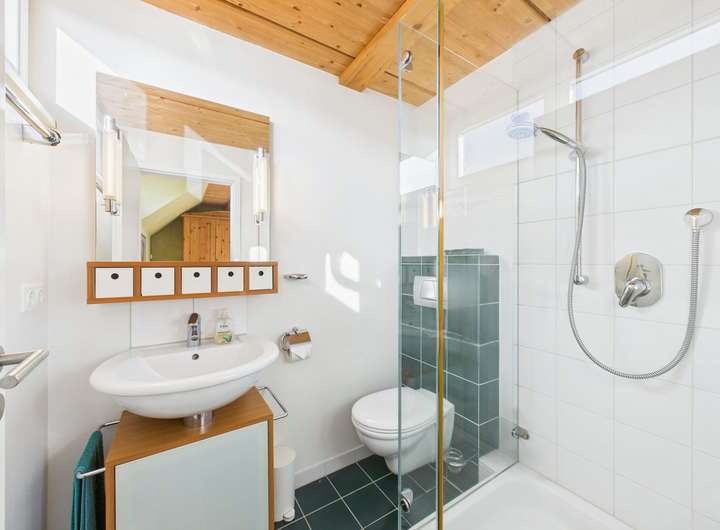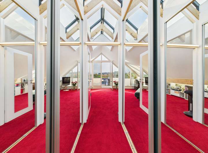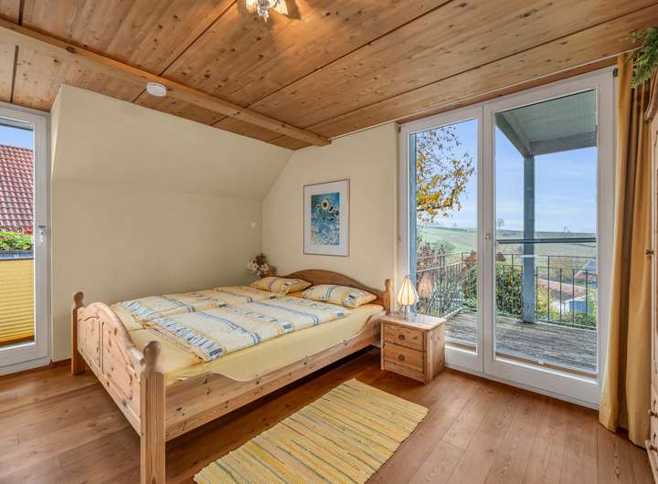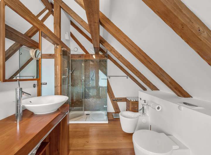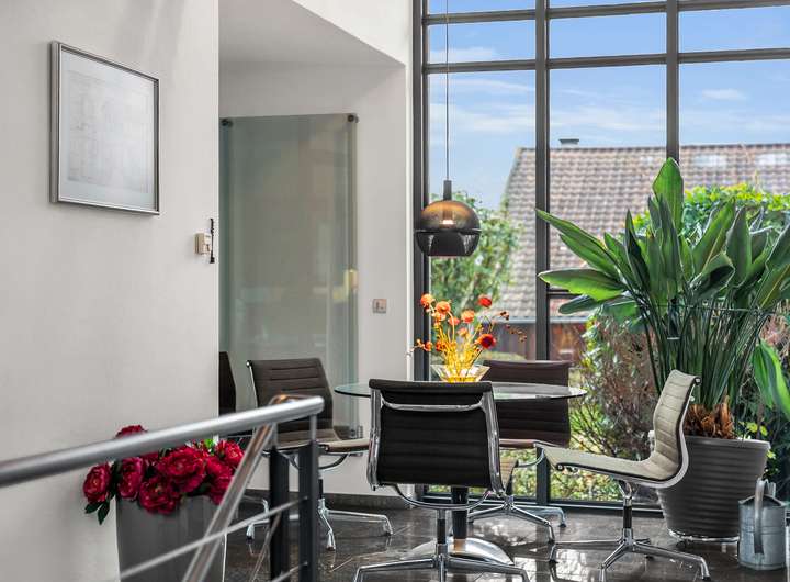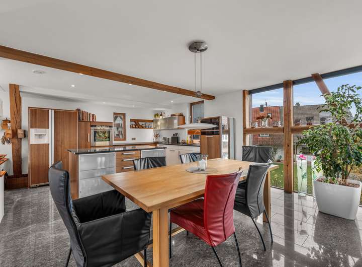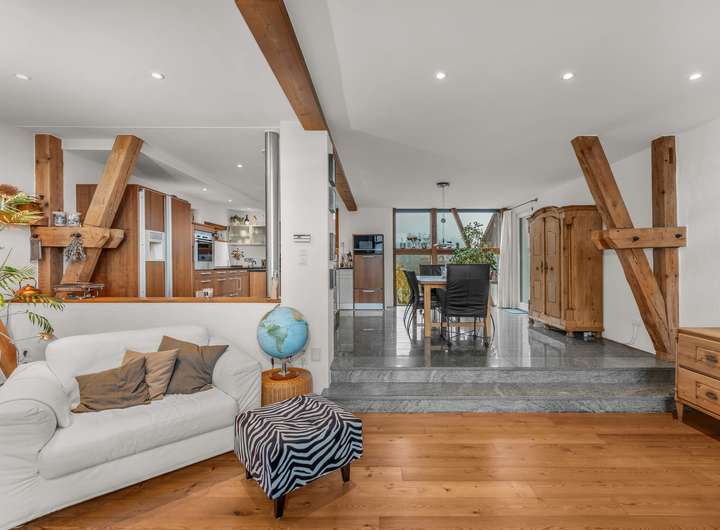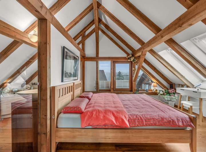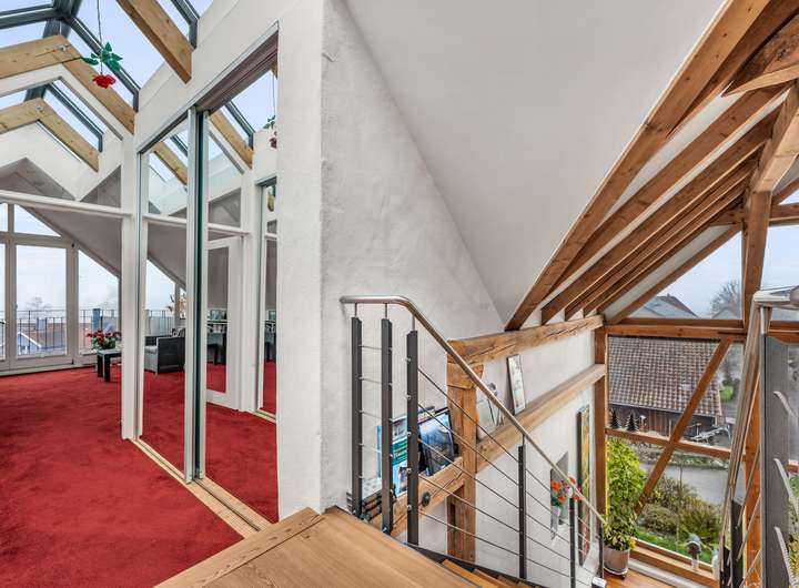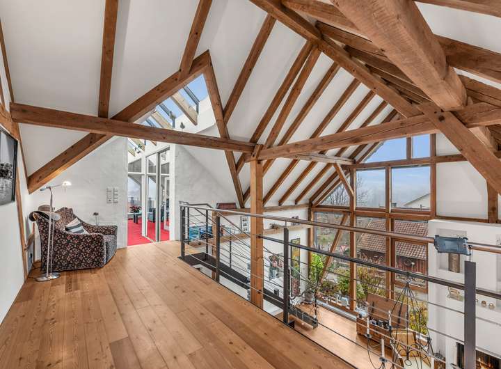 Das Obergeschoss bildet das architektonische Zentrum: ein rund 130 m² großer Wohn- und Essbereich mit originalem Fachwerk, bis zu 6,5 Metern Deckenhöhe, Dachverglasung, Galerie und östlicher Frühstücksterrasse – ein beeindruckender Raum, der Wohnen zu einem besonderen Erlebnis macht. Im Dachgeschoss liegen Schlafzimmer, Bad, Studio mit Ankleide sowie ein Balkon mit Alpenblick.