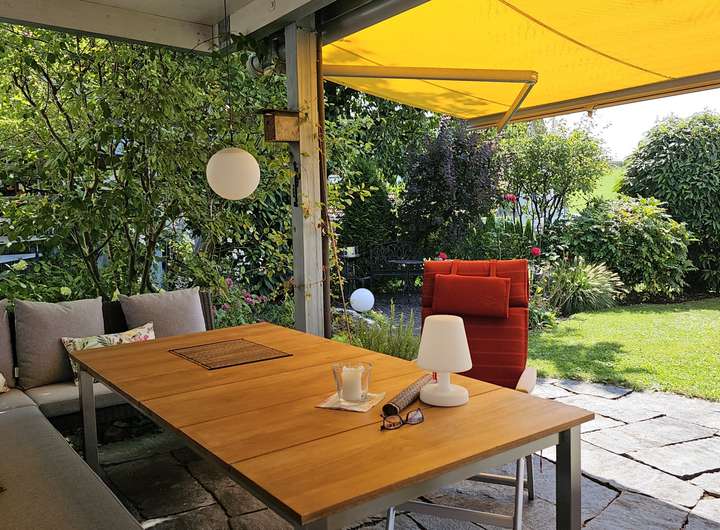 * Überdachte Terrasse mit automatisch gesteuerten Markisen
