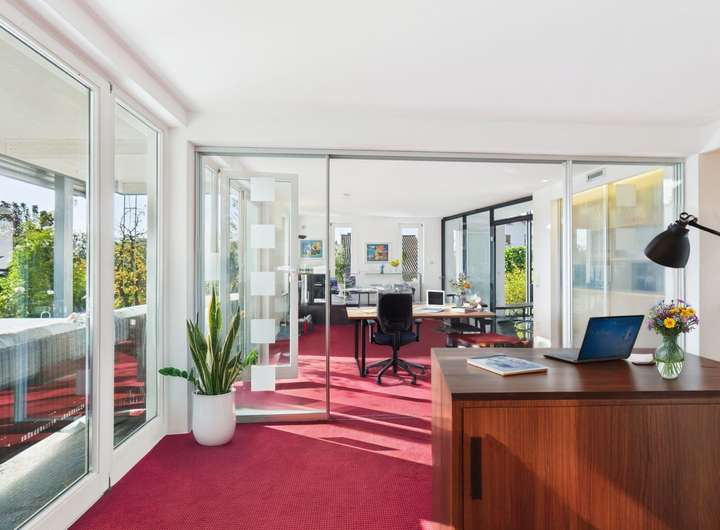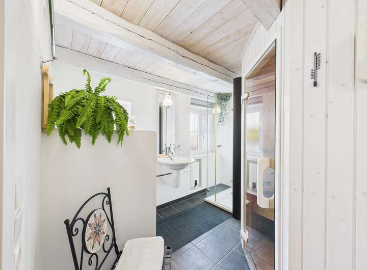Die rund 298 m² Wohnfläche plus etwa 105 m² Nutzfläche verteilen sich auf zehn Zimmer, zwei Vollgeschosse und ein ausgebautes Dachgeschoss. Das Erdgeschoss bietet hohe Flexibilität: Eine derzeit gewerblich genutzte Einheit mit Empfang, zwei Büros und Besprechungsbereich kann ebenso als Praxis, Atelier oder eigenständige Wohneinheit dienen. Ergänzt wird es durch ein Gästeapartment mit Sauna und großem Bad sowie zwei weitere Apartments mit eigenem Bad und Kitchenette, die attraktive Einnahmen im mittleren fünfstelligen Bereich ermöglichen.