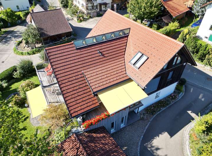 Verglaster First, große Fensterflächen und ein hochwertiger Materialmix aus Stein, Holz, Metall und Glas schaffen eine helle, großzügige Atmosphäre. Der historische Hintergrund – einst Wohnsitz des Zeppelin-Steuermanns Kapitän Schönherr, später Besuchsort bedeutender deutscher Politiker – verleiht dem Haus einen besonderen, seltenen Charakter.