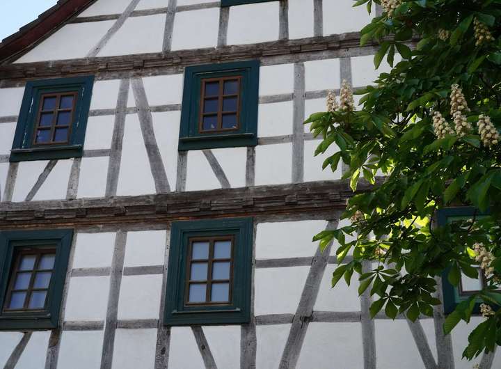 - (Sicht-)Fachwerk in den oberen Geschossen, Mansarddach mit Satteldachgauben