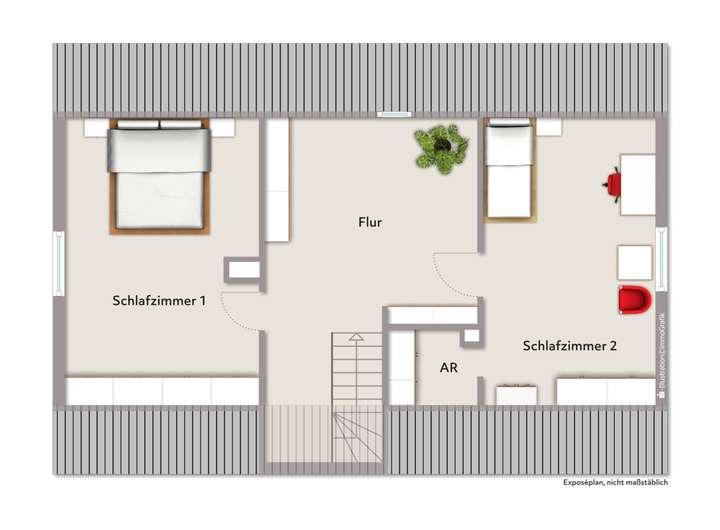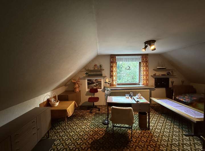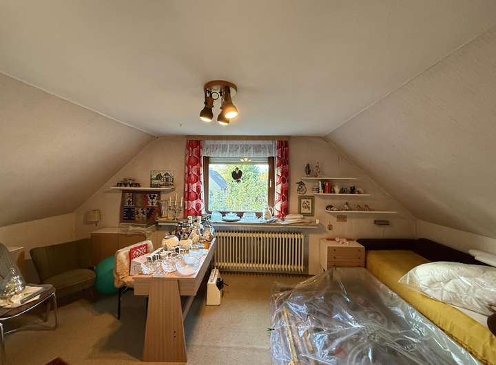 Die Wohnfläche von rund 140 m² verteilt sich im Erdgeschoss auf 4 Zimmer, das Bad und die Küche; im Dachgeschoss auf drei weitere Zimmer (eines als Durchgangszimmer bzw. Flur).