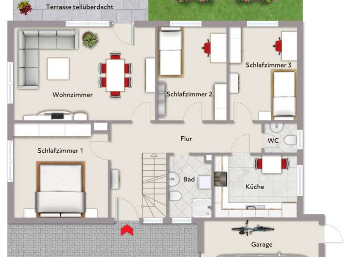 Die Wohnfläche beträgt unter anteiliger Einbeziehung der teilüberdachten Terrasse knapp unter 150 m².