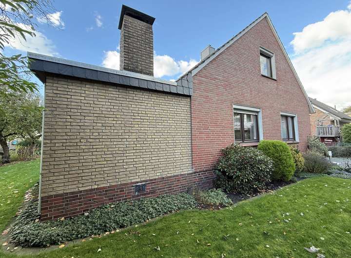 Ca. 1964 wurde dieses Einfamilienhaus in Massivbauweise (teils verklinkert, teils verputzt) errichtet. Es erhielt in späteren Jahren noch eine Terrassenerweiterung und vermutlich in den 1980er bzw. 2000er Jahren neue Fensterverglasungen. Im Wohn- und im Schlafzimmer wurden elektrische Rollläden nachgerüstet. Die ehemals verputzte Giebelwand wurde mit Riemchen in Klinkeroptik an das übrige Mauerwerk angepasst.
