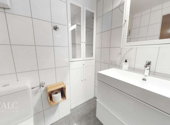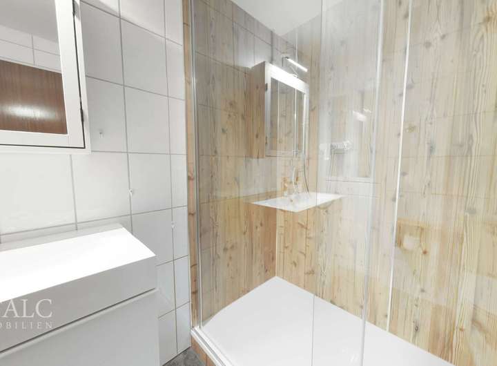 Das Badezimmer überzeugt durch seine zeitgemäße Ausstattung und gepflegte Erscheinung. Besonders hervorzuheben ist die großzügige, bodengleiche Dusche mit eleganter Glasabtrennung, deren warme Holzoptik für eine gemütliche und hochwertige Atmosphäre sorgt. Helle Wandfliesen und ein dunkler Bodenbelag erzeugen einen stilvollen Kontrast und verleihen dem Raum ein freundliches, einladendes Ambiente. Ergänzt wird die Ausstattung durch ein separates Gäste-WC, das zusätzlichen Komfort im Alltag bietet.