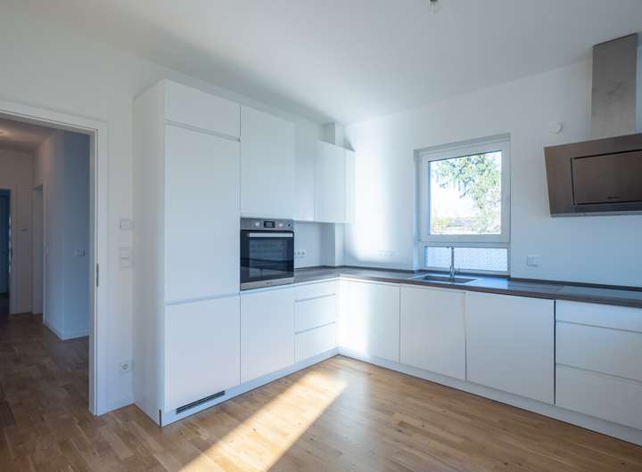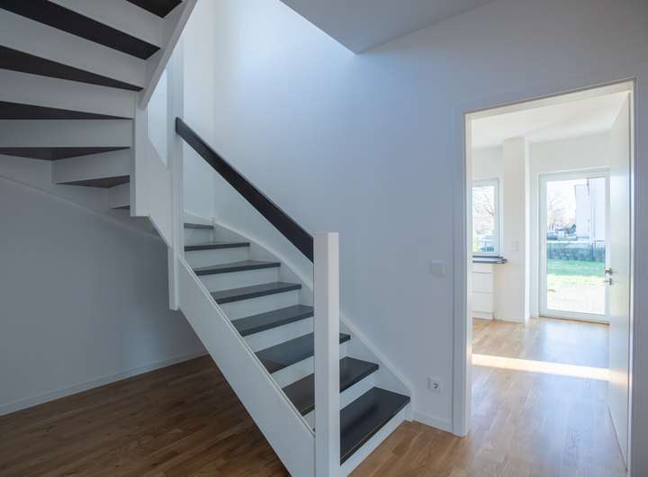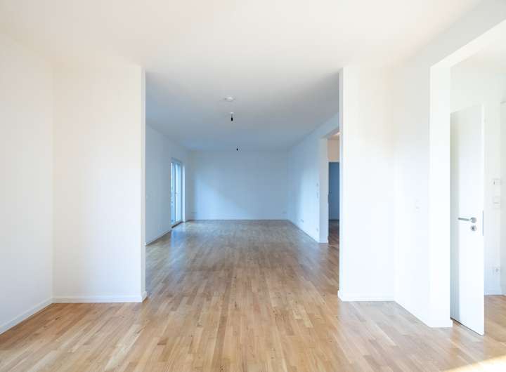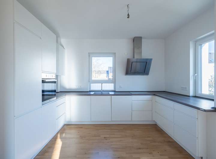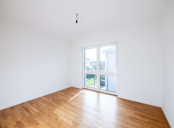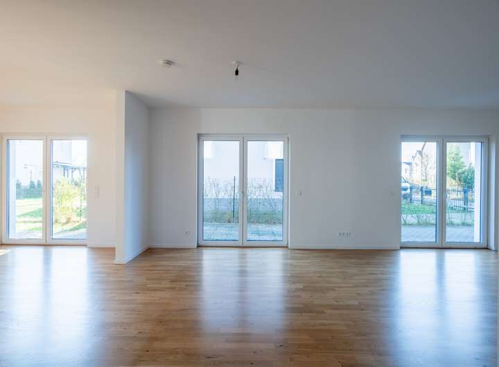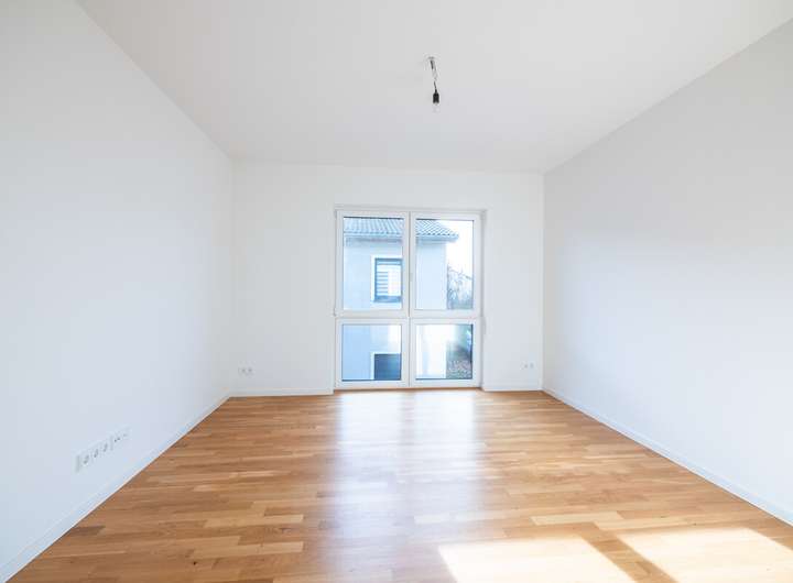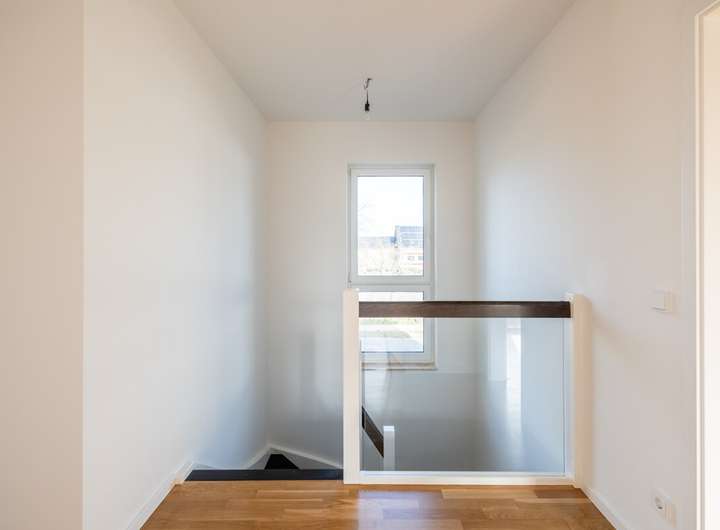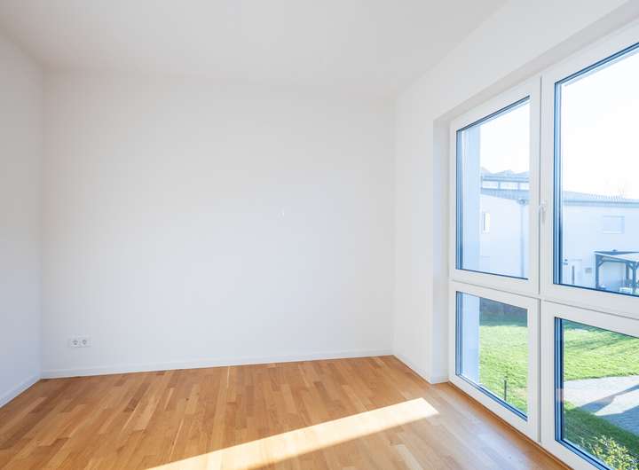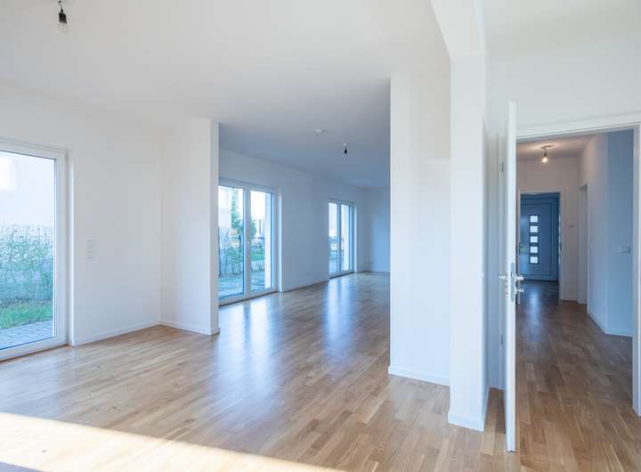 Beim Eintreten führt der Weg direkt vom Windfang in die Diele und von hier öffnet sich der Blick in den großzügigen Wohn-, Koch- und Essbereich, der Ort, an dem das Familienleben beginnt. Bodentiefe Fenster lassen morgens die Sonne herein, während die Fußbodenheizung für Wohlgefühl sorgt. Der Duft von frischem Kaffee, Kinderlachen aus dem Garten und das lebendige Miteinander in der offenen Küche verleihen diesem Raum seine besondere Herzlichkeit. Das Wohnzimmer mit hochwertigem Echtholzparkett bildet das warme Herz des Hauses. Hier entstehen die alltäglichen kleinen Momente, die eine Familie verbinden: gemeinsame Spiele, gemütliche Filmabende oder das erste selbstgebaute Lego-Haus. In der warmen Jahreszeit wird die angrenzende Terrasse zur zweiten Wohnfläche, perfekt für Gartenabenteuer, Familienessen im Freien oder ruhige Abende, an denen der Tag langsam ausklingt.
