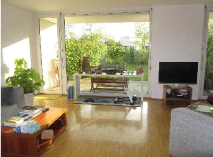 Ein sonniges und geräumiges Wohnzimmer mit großer Fensterfront zum Garten. Zusätzlich befindet sich das Gäste-WC und der Zugang zum Obergeschoss auf dieser Ebene. Im Wohnbereich befindet sich ein Parkettboden.