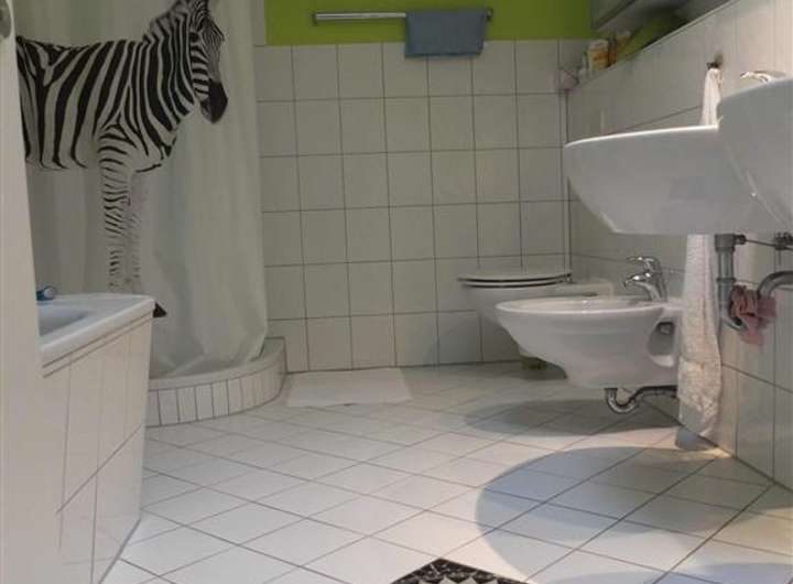 Im Obergeschoss teilen sich 3 helle Zimmer, ein großes Bad mit Wanne, Dusche, 2 Waschbecken, WC und Bidet und Tageslicht durch el. Lichtkuppel den Raum. Die Bodenbeläge hier sind Auslegeware der Firma Tretford.
