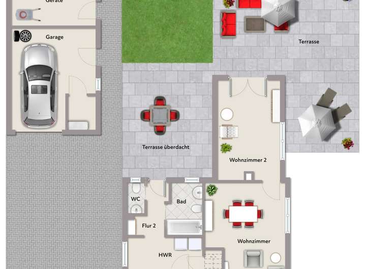 Die vorgenannten m² Angaben sind einer aktuellen Wohnflächenberechnung entnommen, die anteilig auch eine Terrasse und überdachte Terrasse berücksichtigt. Eine bau-/genehmigungsrechtliche Prüfung hat hierbei nicht stattgefunden.