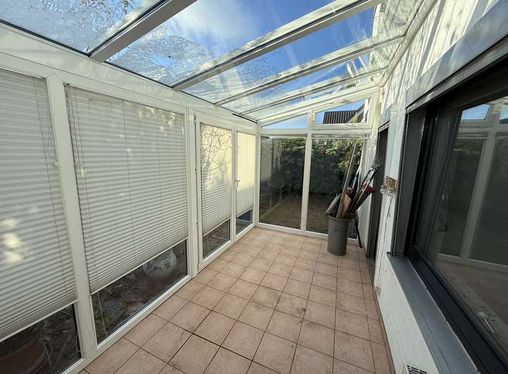 Ein Oberlicht sorgt für eine helle Wohnatmosphäre. Ein weiteres Highlight ist der lichtdurchflutete Wintergarten, der den Innen- und Außenbereich harmonisch miteinander verbindet. Hier lässt es sich wunderbar entspannen, Gäste empfangen oder den Blick in den Garten genießen. Der gepflegte Außenbereich bietet Raum für Spiel, Erholung oder eigene Gestaltungsideen.