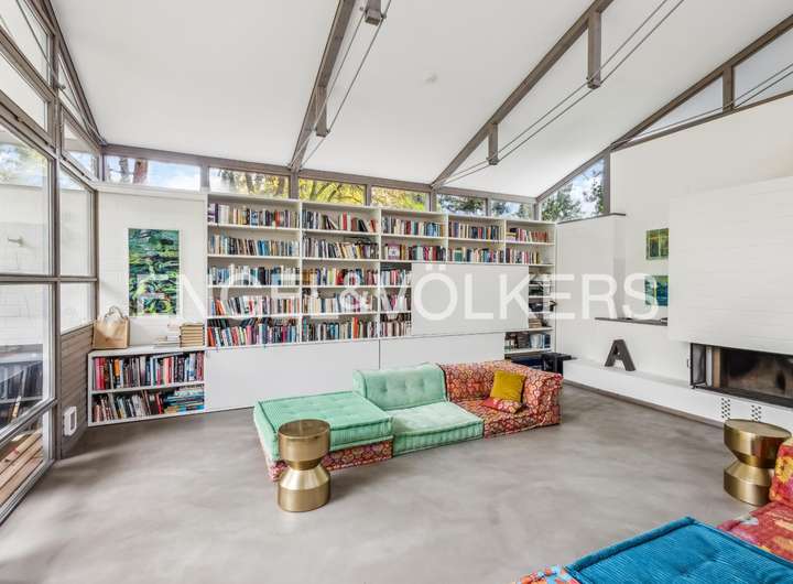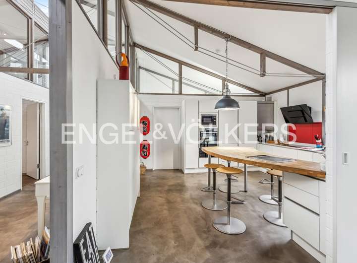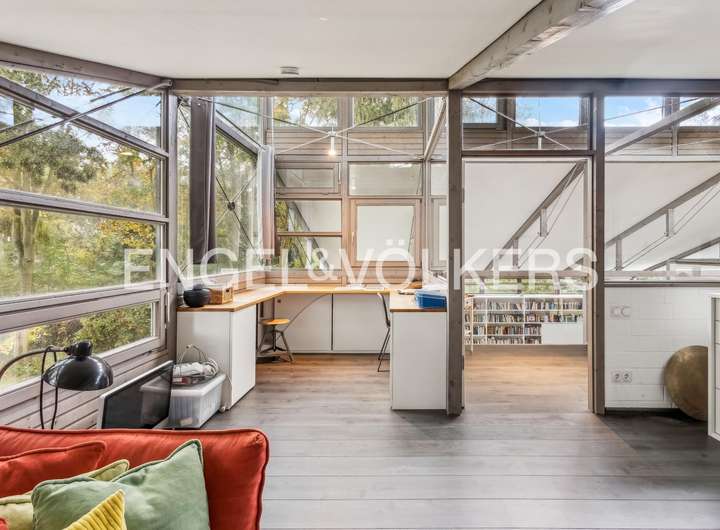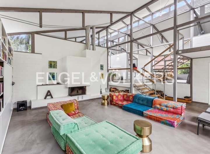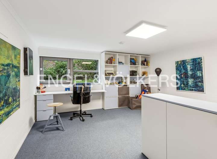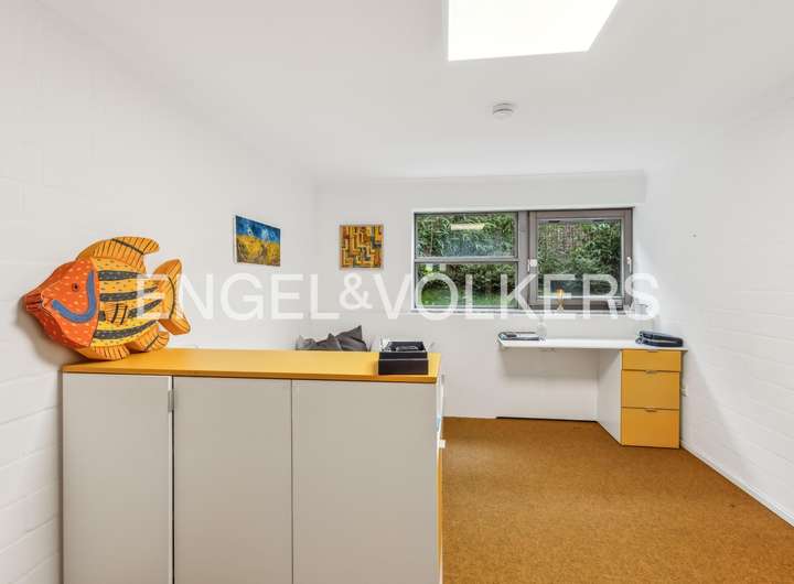An die Küche schließt sich das Esszimmer an, das über den offenen Grundriss fließend mit dem Wohnbereich verbunden ist. Über den Split Level gelangt man nach oben in ein helles Arbeitszimmer, während der untere Bereich das großzügige Wohnzimmer mit Holzkamin und ein weiteres Arbeitszimmer beherbergt.