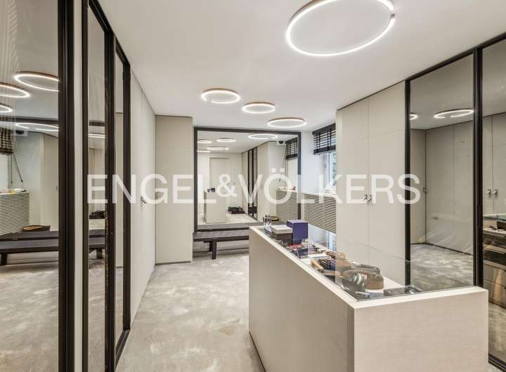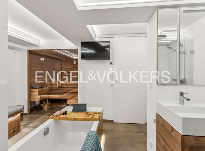 Im Untergeschoss befindet sich ein Ankleidezimmer mit maßgefertigten Einbauschränken sowie ein angrenzender begehbarer Schuhschrank. Weiter den Flur entlang liegen drei helle Kinderzimmer sowie ein großzügiges Badezimmer mit freistehender Badewanne, Dusche und Sauna – ein privater Wellnessbereich für die ganze Familie.