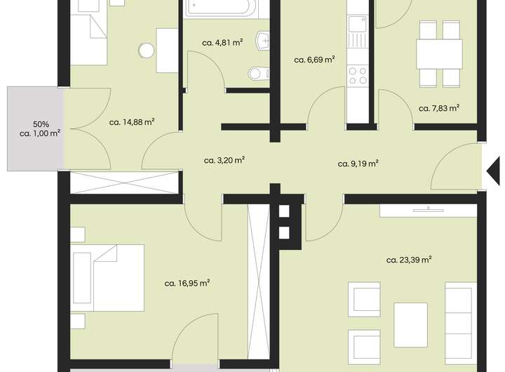 Zwei große und ein kleiner Balkon erweitern den Wohnraum ins Freie und bieten vielfältige Nutzungsmöglichkeiten – vom Frühstück in der Morgensonne bis zu entspannten Abendstunden im Licht des Sonnenuntergangs.