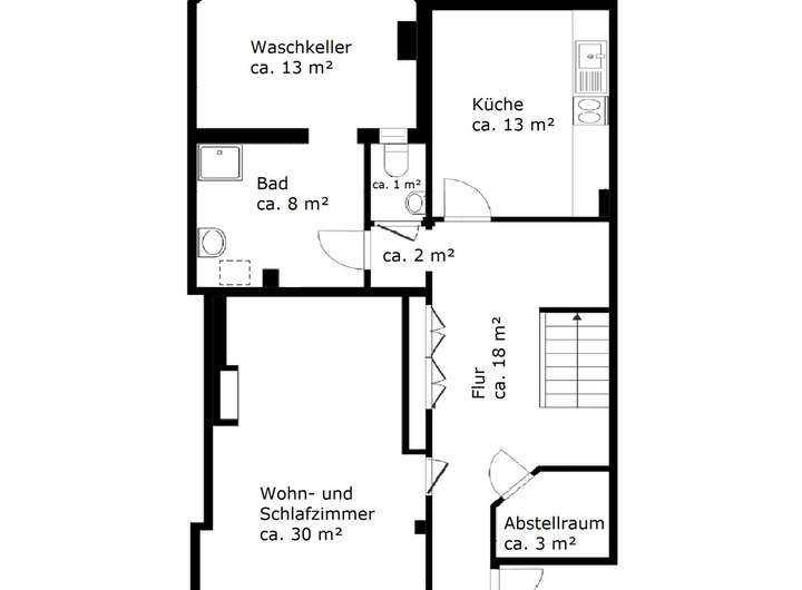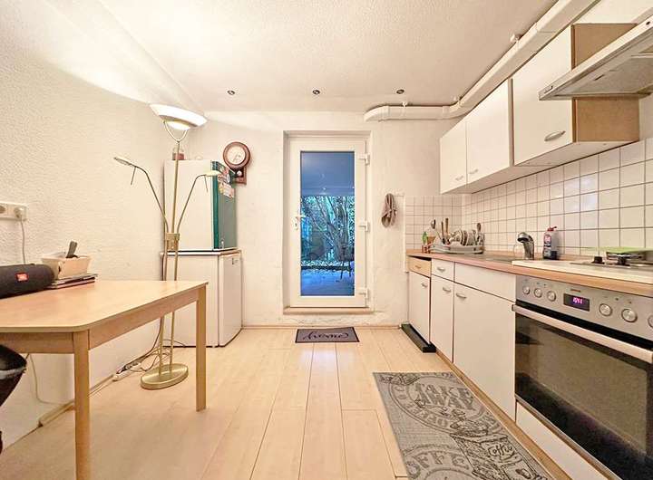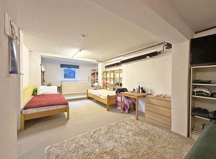 Die dritte Wohneinheit befindet sich im Souterrain der Immobilie und verfügt auf ca. 80 m² Wohnfläche über ein großes Wohn- und Schlafzimmer, eine Küche sowie ein Badezimmer mit Dusche und Waschmaschinenanschluss.