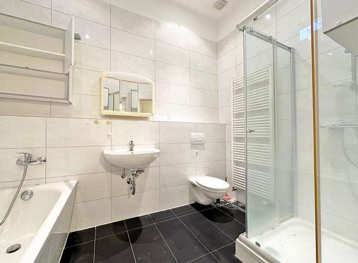 Des Weiteren bietet die Wohnung ein Badezimmer mit Badewanne, Dusche und Waschmaschinenanschluss, ein Gäste-WC und ein Schlafzimmer.