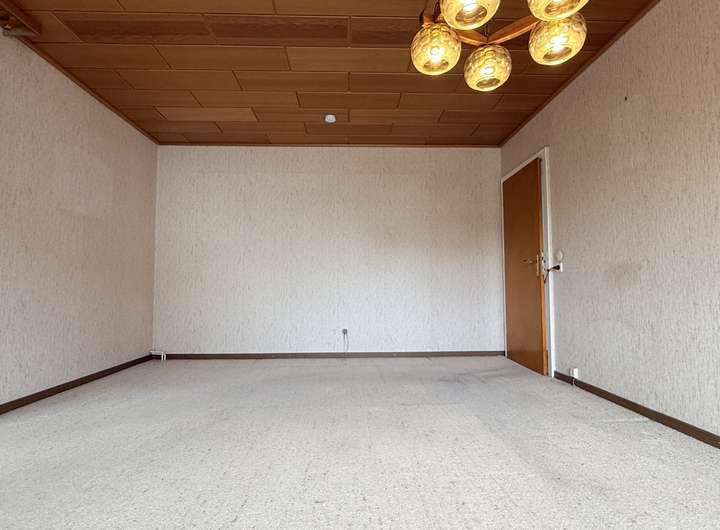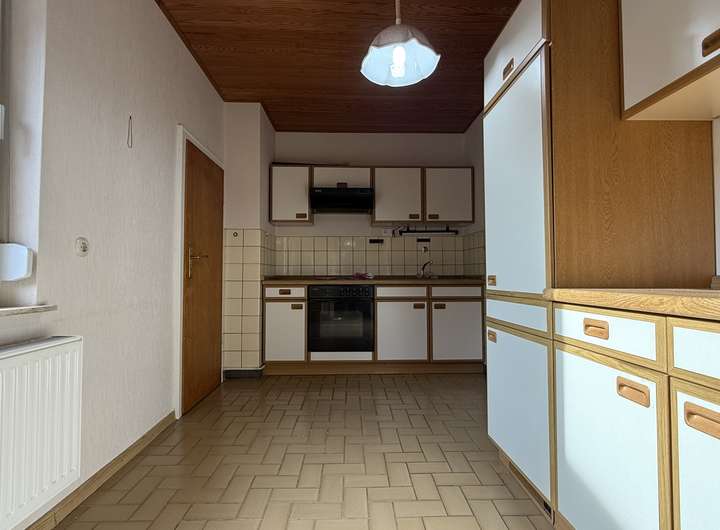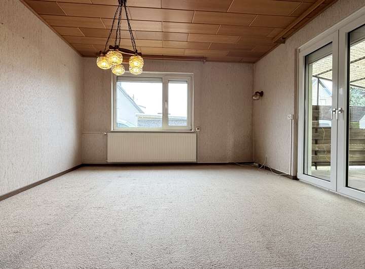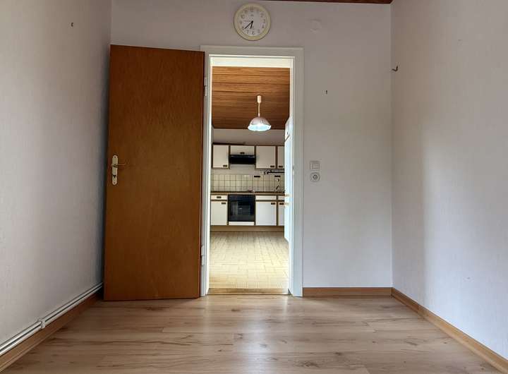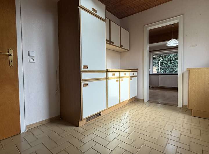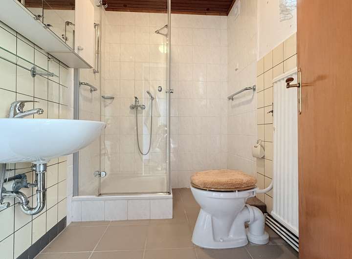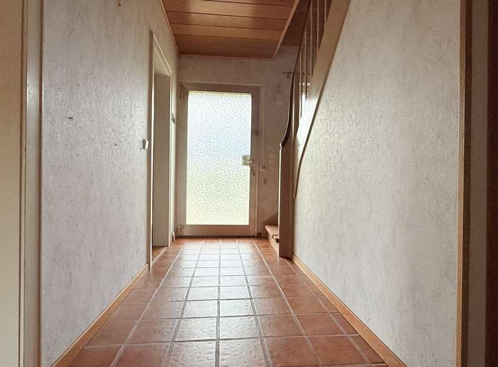 Im Erdgeschoss befinden sich das Wohnzimmer mit Zugang zur überdachten Terrasse, die Küche mit anschließendem kleinem Esszimmer, ein Schlafzimmer, ein kompaktes Badezimmer mit Dusche sowie der Flur mit Treppe ins Obergeschoss und zum Keller.